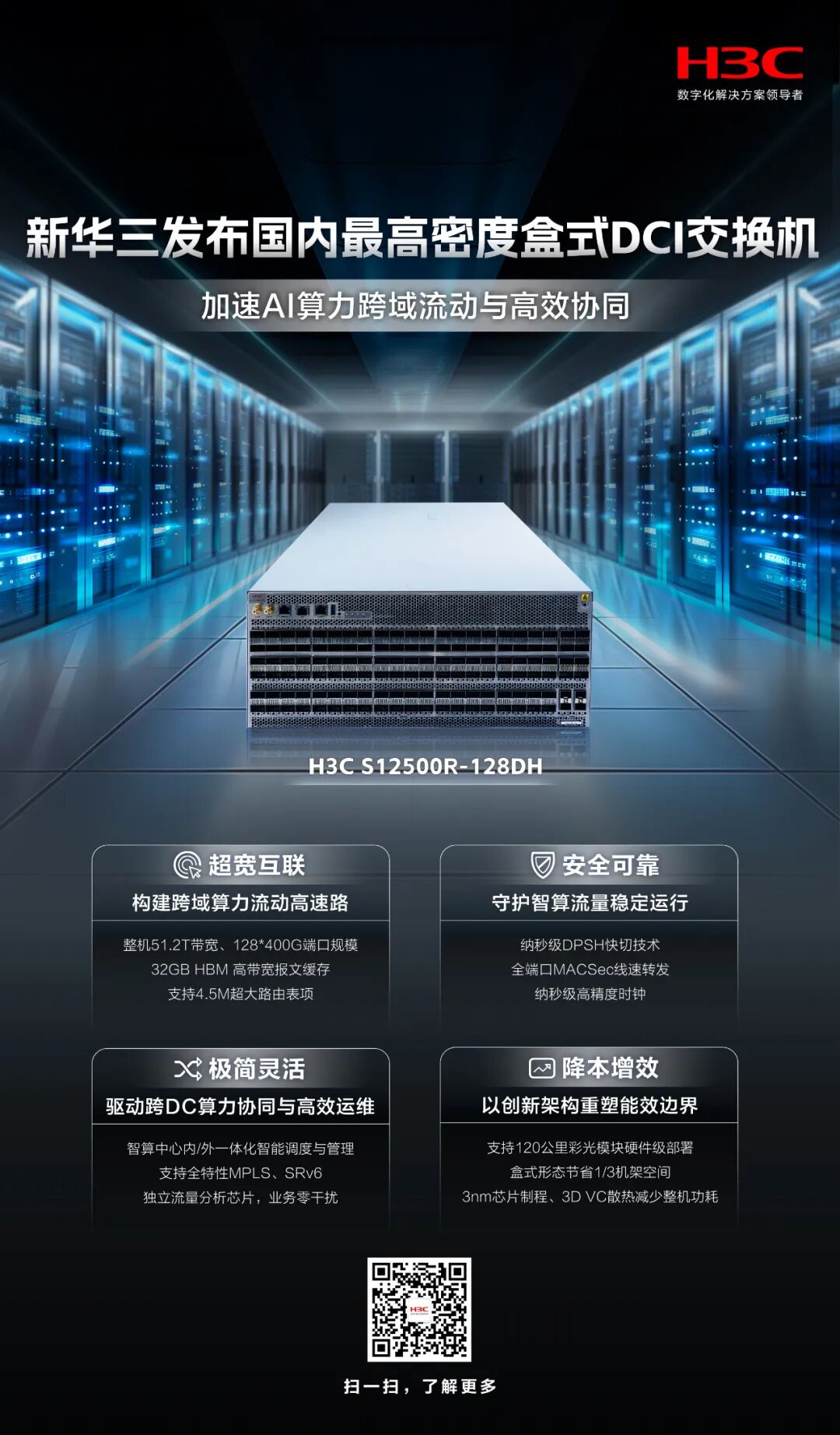 隨著AI大模型的迅猛發(fā)展與智算中心規(guī)模的持續(xù)擴張,跨數(shù)據(jù)中心互聯(lián)(DCI,Data Center Interconnect)正從“連接業(yè)務”邁向“連接算力”的新階段。算力在更大地域范圍內的分布與協(xié)同,正在對網(wǎng)絡帶寬、時延、能效與可靠性提出全新要求。為應對這一趨勢,新華三推出全新高密度盒式DCI交換機H3C S12500R-128DH,以極致性能和創(chuàng)新架構重構DCI互聯(lián)能力,助力智算中心在跨域算力流動中實現(xiàn)更高速、更穩(wěn)定、更高效的連接。