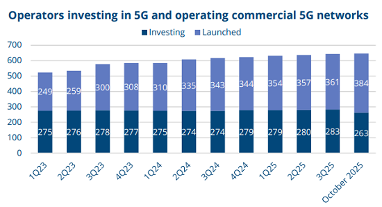 截至2025年10月底,GSA已確認全球191個國家及地區(qū)的647家運營商通過測試、頻譜獲取、規(guī)劃、部署或商用發(fā)布等方式投資5G。其中,143個市場的384家運營商已正式或試商用推出至少一項符合3GPP標準的5G服務(wù)。