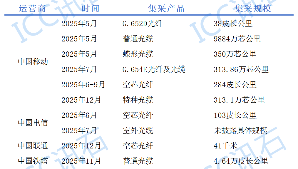 ICC訊 轉(zhuǎn)眼就到2025年末,行業(yè)進(jìn)入到了年度總結(jié)與規(guī)劃期。2025年,我國三大運(yùn)營商及鐵塔公司在光纖光纜領(lǐng)域的集采活動(dòng)呈現(xiàn)出"規(guī)模穩(wěn)健、技術(shù)分化、創(chuàng)新加速"的鮮明特征。2025年國內(nèi)普通光纜的需求處于疲軟下滑的趨勢(shì),而對(duì)新型光纖需求大增??招竟饫w成為中國移動(dòng)、中國電信、中國聯(lián)通共同布局重點(diǎn),據(jù)ICC不完全統(tǒng)計(jì),2025年三大運(yùn)營商對(duì)空芯光纖的集采總量超400皮長(zhǎng)公里,凸顯了對(duì)下一代低時(shí)延、大容量技術(shù)的探索。
