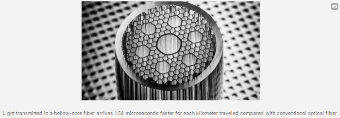 空芯光纖(HCF)是光纖介質(zhì)的下一個重大進展,它通過空氣或真空而非玻璃來導(dǎo)引激光。簡而言之,光在玻璃中的傳輸速度比在空心的管道(波導(dǎo))中慢,而且玻璃也限制了可用于數(shù)據(jù)傳輸?shù)墓忸l數(shù)量。如果將單模光纖比作標準高速公路,那么空芯光纖就是高速公路,它能降低延遲、增加當前傳輸距離,并具有未來進一步提升速度的潛力。