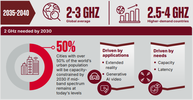 這份名為《2040愿景:未來移動連接的頻譜》(文末附下載鏈接)的報告是對即將到來的“6G”時代頻譜需求的全面全球評估。報告得出結(jié)論,到2035-2040年,每個國家平均需要2-3 GHz的全球中頻段頻譜,以滿足需求最高的城市地區(qū)的移動網(wǎng)絡(luò)容量需求,需求較高的國家則需要2.5-4 GHz。
