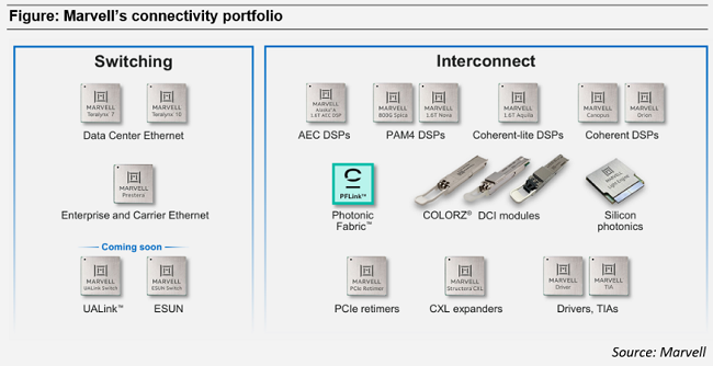 下圖展示了Celestial AI的“光子互聯(lián)架構(gòu)”如何融入Marvell的連接產(chǎn)品組合。它雖然是整個拼圖的一小塊,但對公司的未來可能至關(guān)重要。它與“即將推出”的UALink和ESUN交換芯片(左下角)具有協(xié)同效應(yīng)。ESUN代表用于縱向擴展網(wǎng)絡(luò)(Scale-Up Networking )的以太網(wǎng),在我們看來,這正是真正需要CPO的領(lǐng)域。