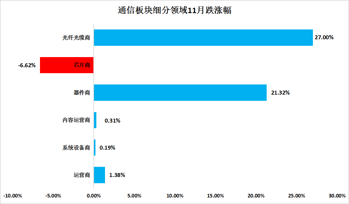 細分領(lǐng)域來看,ICC所統(tǒng)計的互聯(lián)網(wǎng)內(nèi)容運營商股指為211.1,相比上個月的210.45略微增長。運營商指數(shù)為122.53,10月底股指為120.68,環(huán)比增長1.38%。設(shè)備商股指為172.24,與上月相比基本持平。器件商股指為519.95比上月的428.359增長了21.32%。11月幾家國外主要上市公司公布三季度業(yè)績報告,業(yè)績表現(xiàn)亮眼。芯片商股指為1420.09,比上月的1520.8下滑了6.62%。光纖光纜商股指為294.26,相比上月的231.7相比增長27%。