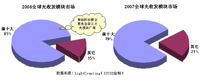2008年,來自前十大光收發(fā)模塊廠商的收入占整個市場收入的85%,相比2007年上升了6個百分點,市場份額的增長主要來自前三大光模塊供應商。并且這種趨勢可能還會持續(xù)下去,因為在目前經(jīng)濟衰退的現(xiàn)狀下,為減低風險,客戶會更青睞規(guī)模較大的供應商。