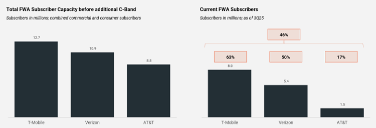 這3200萬容量包括2060萬消費(fèi)級(jí)FWA用戶和1180萬企業(yè)客戶。但New Street指出,該數(shù)字未計(jì)入未來C波段上段頻譜拍賣可能帶來的任何額外容量。美國聯(lián)邦通信委員會(huì)(FCC)必須在2027年7月4日前舉行此次拍賣。該公司估計(jì),拍賣可能為運(yùn)營商再帶來400萬FWA用戶容量,使其總?cè)萘窟_(dá)到約3600萬。不過,在拍賣進(jìn)行之前,運(yùn)營商們正在充分利用他們現(xiàn)有的頻譜。