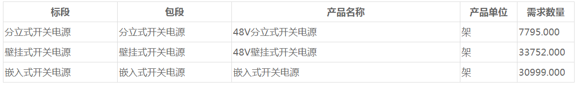 第一標(biāo)包:48V分立式開(kāi)關(guān)電源;第二標(biāo)包:48V壁掛式開(kāi)關(guān)電源;第三標(biāo)包:嵌入式開(kāi)關(guān)電源。