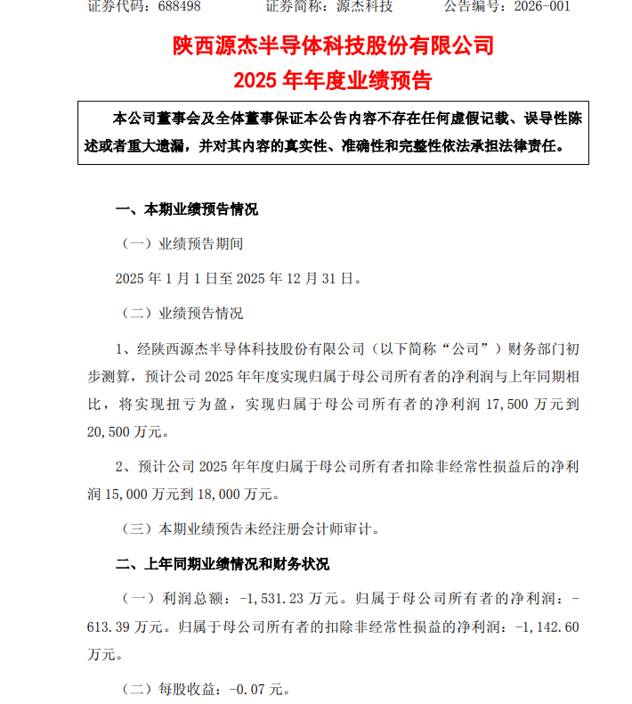 ICC訊 源杰科技1月30日發(fā)布2025年年度業(yè)績(jī)預(yù)告,預(yù)計(jì)2025年全年實(shí)現(xiàn)扭虧為盈。經(jīng)公司財(cái)務(wù)部門初步測(cè)算,2025年度歸屬于母公司所有者的凈利潤(rùn)預(yù)計(jì)為1.75億元到2.05億元,上年同期為虧損613.39萬(wàn)元;扣除非經(jīng)常性損益后的凈利潤(rùn)預(yù)計(jì)為1.5億元到1.8億元,上年同期為虧損1142.60萬(wàn)元。