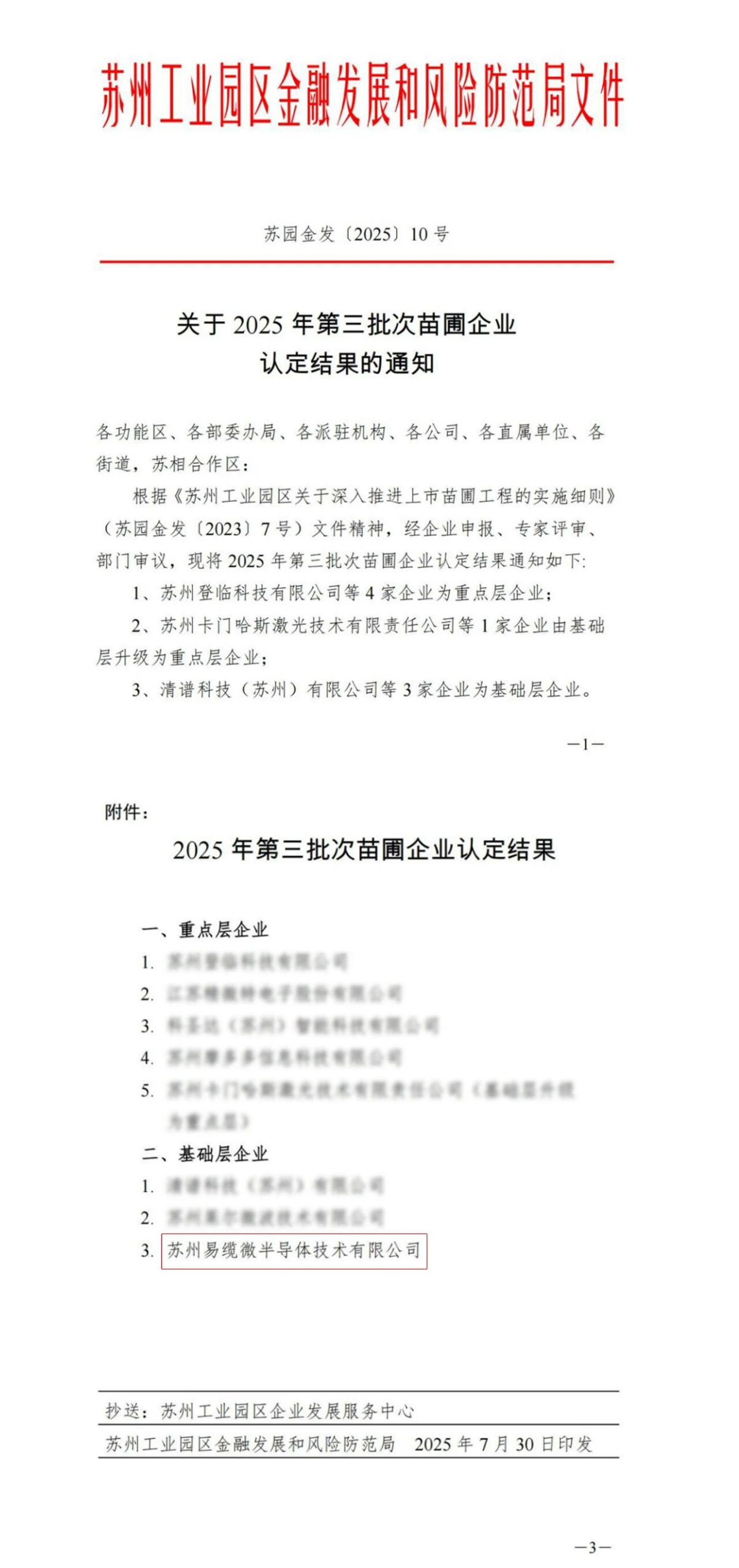 2025年7月30日,蘇州工業(yè)園區(qū)金融發(fā)展和風(fēng)險(xiǎn)防范局發(fā)布第三批次苗圃企業(yè)認(rèn)定名單,易纜微憑借突出的技術(shù)實(shí)力與強(qiáng)勁的發(fā)展?jié)摿Τ晒θ脒x,將作為重點(diǎn)上市后備企業(yè)獲得相關(guān)政策與服務(wù)的支持。此次易纜微的成功入選也彰顯了政府部門對(duì)其技術(shù)創(chuàng)新價(jià)值與產(chǎn)業(yè)引領(lǐng)作用的高度認(rèn)可。