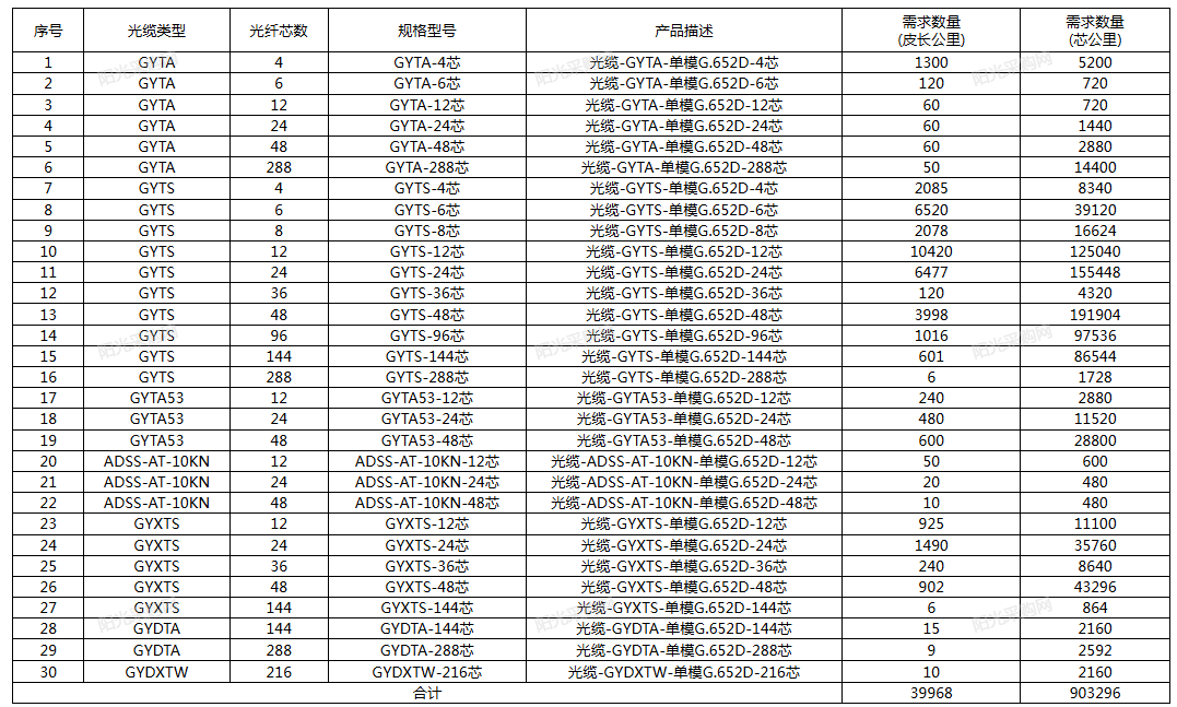 本次招標(biāo)覆蓋山東省十六地市,共30種型號(hào)室外光纜,涵蓋GYTA、GYTS、GYTA53、ADSS、GYXTS、GYDTA、GYDXTW七大系列,芯數(shù)自4芯到288芯,光纖均為G.652D單模。其中,GYTS-12芯需求最大,達(dá)125040芯公里;GYTS-24芯、GYTS-48芯緊隨其后,分別為155448芯公里、191904芯公里。