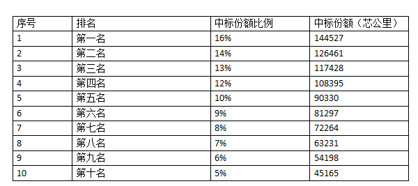 招標(biāo)設(shè)置10個(gè)中標(biāo)人,按綜合排名分配份額:第一名16%(144527芯公里),依次遞減至第十名5%(45165芯公里)。
