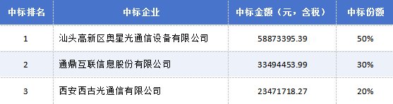 ICC訊 日前,中國鐵塔2025-2026年光纜集采結(jié)果出爐,三家企業(yè)中標(biāo)。汕頭高新區(qū)奧星光通信設(shè)備有限公司以5887萬元(含稅)報價位列第一中標(biāo)人,通鼎互聯(lián)信息股份有限公司和西安西古光通信有限公司分別以3349萬元和2347萬元含稅報價位列第二、第三中標(biāo)人。