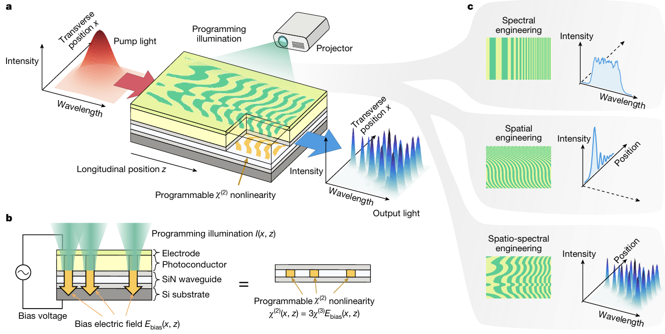 當(dāng)在襯底和頂部電極之間施加偏置電壓時(shí),光電導(dǎo)體層充當(dāng)可編程電阻網(wǎng)絡(luò)。通過(guò)將圖案化照明投射到器件表面,研究人員可以控制光電導(dǎo)體在何處變得導(dǎo)電。在被照明的區(qū)域,光電導(dǎo)體允許電場(chǎng)穿透到波導(dǎo)芯層,而黑暗區(qū)域則阻擋電場(chǎng)。這創(chuàng)建了一個(gè)與照明圖案相對(duì)應(yīng)的電場(chǎng)空間圖案。由于有效的χ(2)非線性與這個(gè)電場(chǎng)成正比,結(jié)果就是一個(gè)可編程的光學(xué)非線性圖案,只需改變照明圖案就可以更新。