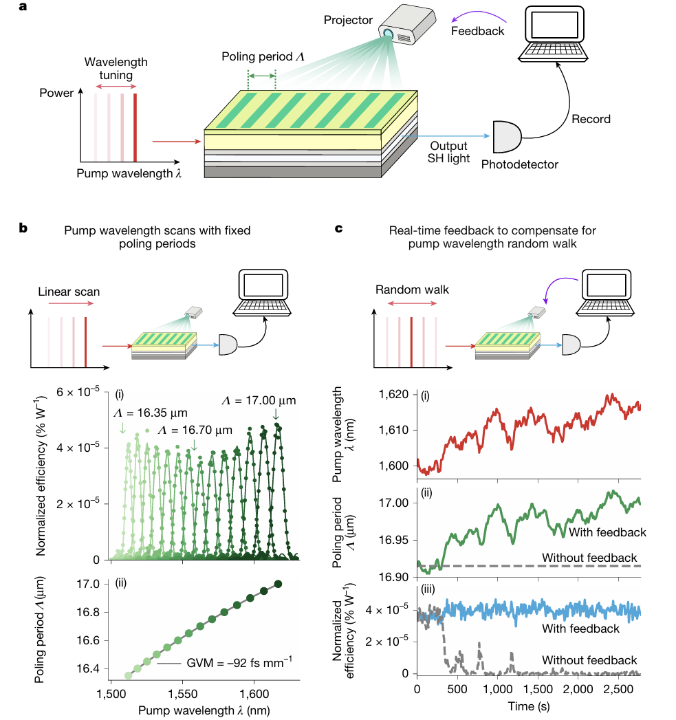 圖2:使用可編程非線性波導(dǎo)進(jìn)行實(shí)時(shí)可編程周期極化,展示反饋控制如何在泵浦波長(zhǎng)隨機(jī)波動(dòng)的情況下保持高轉(zhuǎn)換效率。