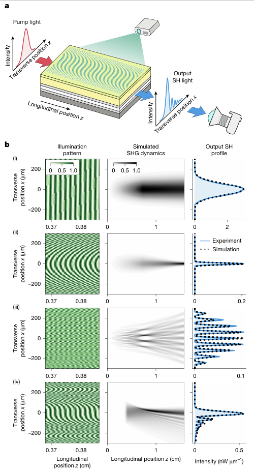 圖1:可編程非線性波導(dǎo)的工作原理和功能,說(shuō)明結(jié)構(gòu)光投射到器件表面如何編程非線性圖案,從而實(shí)現(xiàn)對(duì)二次諧波產(chǎn)生的多功能控制。