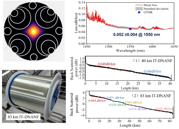在ECOC最受矚目的 postdeadline paper (PDP)環(huán)節(jié),領纖科技重磅發(fā)布了一種創(chuàng)新結構——間隙管輔助嵌套無節(jié)點反諧振空芯光纖(interstitial-tube assisted double-nested anti-resonant nodeless fiber, IT-DNANF),首次實現(xiàn)了83 公里單段拉絲長度與0.052 dB/km的超低損耗,不僅雙雙刷新世界紀錄,更重要的是,為空芯光纖的大規(guī)模生產提供了切實可行的路徑。