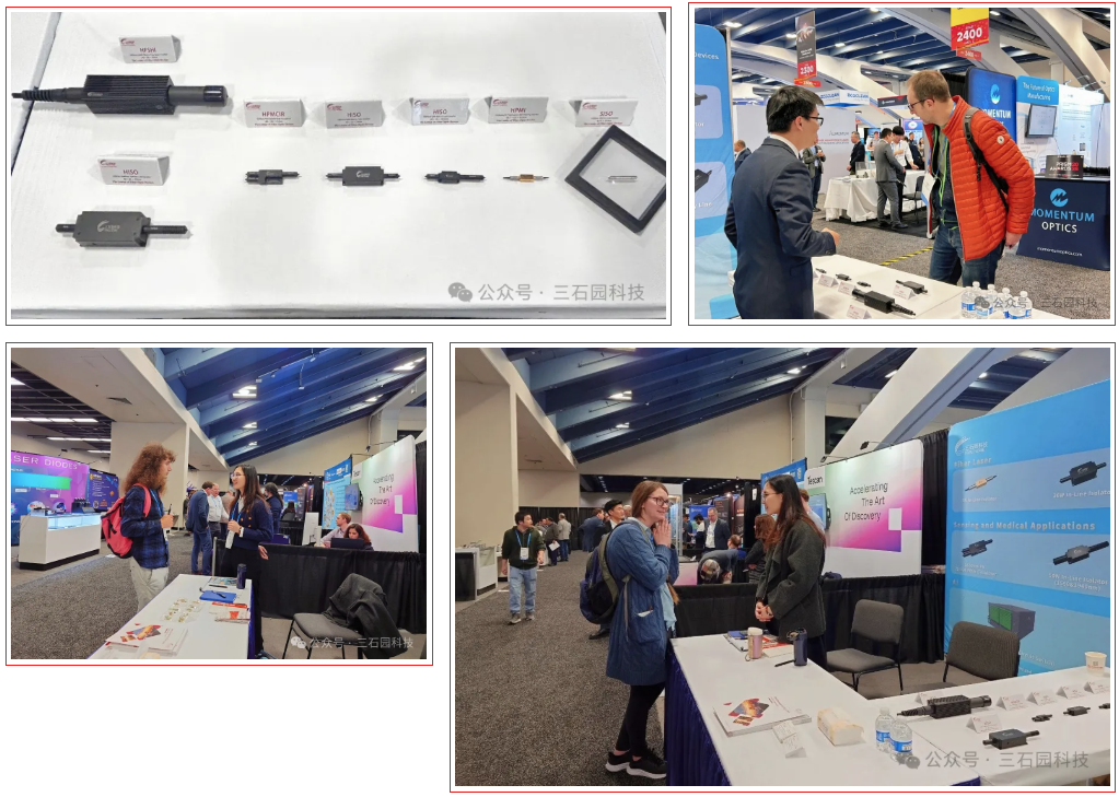 三石園科技首次參加美國西部光電展,展示了1064nm 250W光纖到自由空間隔離器、1940nm 50W 在線隔離器、1550nm PM 25/300 光纖環(huán)形器等多款光纖激光器件產(chǎn)品及創(chuàng)新應(yīng)用方案,旨在滿足市場對更高功率、更小尺寸、更優(yōu)性能的持續(xù)追求。吸引眾多觀眾前來參觀交流。