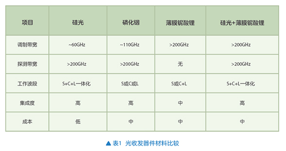 光收發(fā)器件方面,隨著光芯片大帶寬需求推動,各種新材料器件研究也成為熱門,如高電光系數(shù)的鉭酸鋰、鈦酸鋇、鋯鈦酸鉛、有機(jī)聚合物、石墨烯等。光器件新材料的應(yīng)用需要有成本或性能優(yōu)勢,以硅光技術(shù)為平臺,集成其他新材料實現(xiàn)取長補(bǔ)短是重要的技術(shù)發(fā)展方向。光收發(fā)器件材料特性如表1所示,其中硅光+薄膜鈮酸鋰的異質(zhì)集成可能是未來相干光器件的主流技術(shù)路線,其支持實現(xiàn)S+C+L一體化,支持2030年左右所需的400GBd+波特率:發(fā)送端硅光無源元件支持多波段工作,薄膜鈮酸鋰波導(dǎo)僅為調(diào)制部分,帶寬可達(dá)200GHz以上;接收端采用熱調(diào)相位實現(xiàn)多波段90°相位差的精確混頻,鍺探測器通過降低光生載流子渡越時間和優(yōu)化串行電阻支持200GHz以上帶寬。