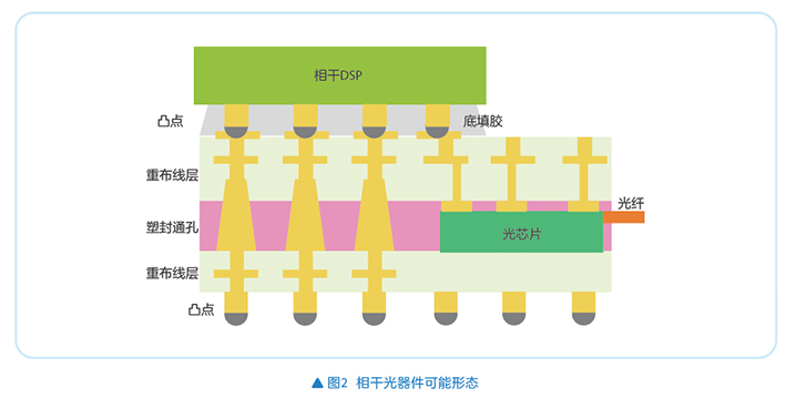 器件封裝方面,光芯片、電芯片和DSP芯片之間高速信號互聯(lián)優(yōu)化是光器件封裝演進(jìn)的驅(qū)動力,光電子器件將借鑒集成電路行業(yè)封裝技術(shù),如銅凸點(diǎn)、銅銅鍵合、芯片通孔、集成電容、有機(jī)基板、類載板、玻璃基板等技術(shù),光電子器件與集成電路封裝的主要區(qū)別在于光芯片需要光耦合,以及在封裝工藝過程中需做好光芯片耦合面的防護(hù)。近中期光電子器件封裝架構(gòu)有可能是光芯片作為中介板,調(diào)制驅(qū)動和探測跨阻放大芯片倒裝在光芯片之上,接口高速信號通過光芯片的通孔與電芯片互聯(lián),光芯片和電芯片采用銅銅鍵合或凸點(diǎn)焊接的方式以實現(xiàn)較短的傳輸路徑和較小的寄生效應(yīng),DSP芯片和光電芯片共基板進(jìn)行封裝。圖2給出了中長期相干光器件一種可能的極簡形態(tài):采用扇出晶圓級封裝工藝,相干DSP芯片集成控制管理、調(diào)制驅(qū)動/跨阻放大、電容功能,相干DSP倒裝,和光芯片通過重布線層互聯(lián),相干DSP在上利于散熱。