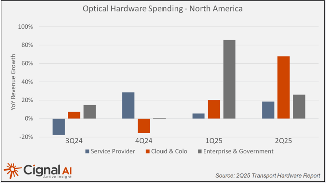 - 若排除中國市場,光設(shè)備銷售額同比增長15%,原因是云與數(shù)據(jù)中心運營商的支出激增至近10億美元,同時服務(wù)提供商在經(jīng)歷長期庫存消化后重新開始采購。