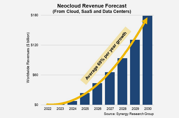 ICC訊 Synergy研究集團(tuán)的新數(shù)據(jù)顯示,新云(Neocloud)收入在2025年第二季度已突破50億美元大關(guān),較去年增長205%。預(yù)計全年收入將超過230億美元。Synergy預(yù)測,到2030年,新云收入將達(dá)近1800億美元,年均增長率為69%。