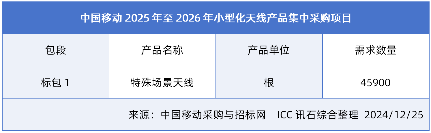 ICC訊 近日,中國(guó)移動(dòng)發(fā)布“2025年至2026年室分天線產(chǎn)品集中采購(gòu)項(xiàng)目”與“2025年至2026年小型化天線產(chǎn)品集中采購(gòu)項(xiàng)目”兩則天線集采公告。