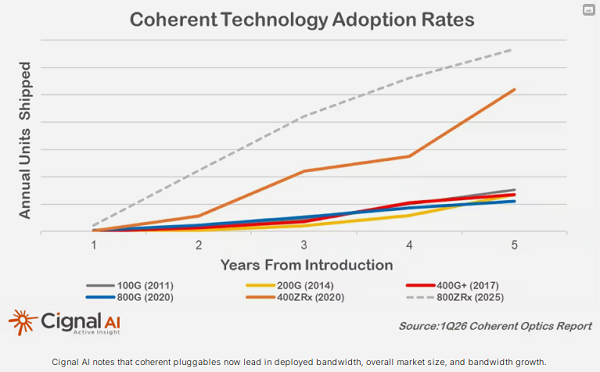 Cignal AI的Wilkinson對此表示贊同。他表示:“400ZRx是迄今為止應用最廣泛的相干技術,而隨著超大規(guī)模數(shù)據(jù)中心部署更高速率以支持數(shù)據(jù)中心互聯(lián)和AI,800ZRx有望超越它?!?
