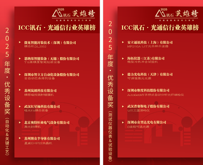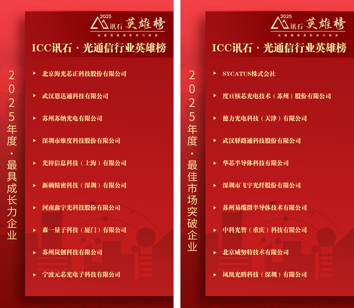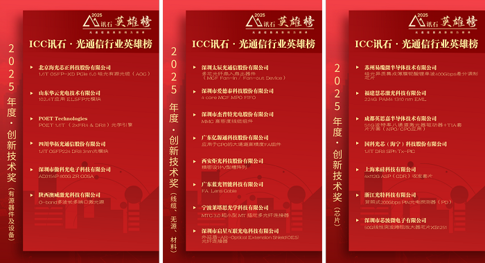 第十二屆ICC訊石·光通信行業(yè)英雄榜評選結(jié)果在IFOC訊石光通信大會·年度論壇暨2025“訊石英雄榜”頒獎典禮正式揭曉,共公布7類獎項名單,在超過150款光通信產(chǎn)業(yè)申報提名產(chǎn)品中,評選出70款優(yōu)秀產(chǎn)品代表,包括2025年度產(chǎn)品類“最具競爭力產(chǎn)品”、“最具競爭力設備”、“優(yōu)秀品質(zhì)獎”、“創(chuàng)新技術獎”、“優(yōu)秀設備獎”五大獎項,及20家入選企業(yè)/團隊類“最具成長力企業(yè)”、“最佳市場突破企業(yè)”二大獎項,同時還公布“產(chǎn)學研投融合獎”、“技術創(chuàng)新”和”市場精英獎“等7位獲得者。評選出2025年度光通信行業(yè)乘風破浪、創(chuàng)新向上的企業(yè)、產(chǎn)品/技術以及先進個人名單,表彰引領行業(yè)做出突出貢獻的產(chǎn)品和技術,鼓勵具有成長潛力的行業(yè)生力軍,助力企業(yè)產(chǎn)品和項目更好地洞悉市場環(huán)境與跨界趨勢,實現(xiàn)跨越式發(fā)展。