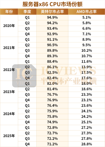 但這一雙寡頭格局正加速生變,英特爾長(zhǎng)期以來(lái)的主導(dǎo)地位持續(xù)承壓,AMD 則憑借技術(shù)突破實(shí)現(xiàn)份額穩(wěn)步攀升。