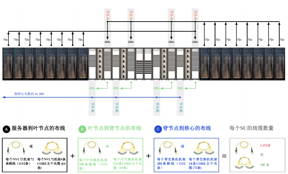 每個含16個NVL72機(jī)架的可擴(kuò)展單元(SU)共需要1152條到葉交換機(jī)的MPO-8/12 APC 8芯連接(每臺服務(wù)器4條 – 每個機(jī)架72條)