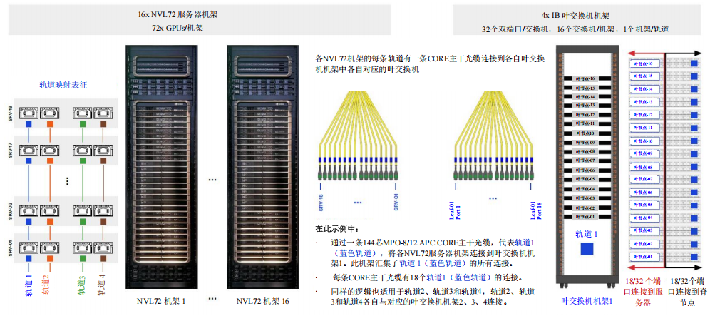 對于A級布線,我們將使用CORE主干光纜來展示從NVL72機(jī)架到可擴(kuò)展單元內(nèi)InfiniBand葉交換機(jī)機(jī)架的連接,因?yàn)槭褂盟鼈兛梢院喕呙芏菺PU集群中的布線。如果選擇使用單根跳線,則可以按照軌道映射進(jìn)行布線。