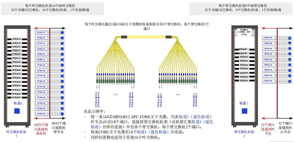 使用CORE主干光纜時,單根144芯主干光纜可將軌道1(藍(lán)色軌道)葉節(jié)點(diǎn)-01的18個端口路由到脊交換機(jī)機(jī)架內(nèi)的各個脊交換機(jī),每個脊交換機(jī)2個端口,如圖17所示。