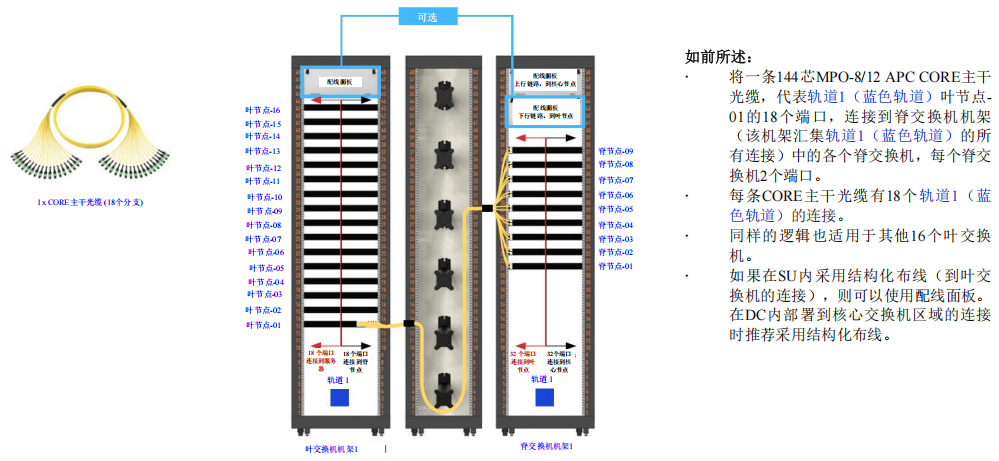 每條CORE主干光纜的設(shè)計都適于處理軌道1(藍(lán)色軌道)的18個連接,簡化布線的同時降低復(fù)雜性。同樣的原理也適用于軌道1(藍(lán)色軌道)內(nèi)其他16個葉交換機(jī),每個葉交換機(jī)都采用相同的CORE主干光纜配置來建立與脊交換機(jī)機(jī)架的連接。