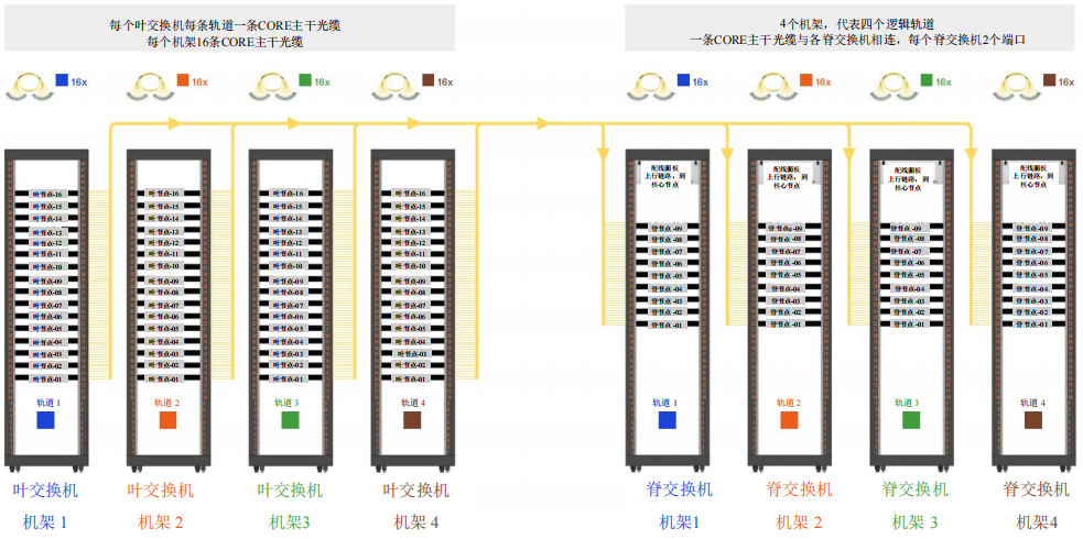 上文我們提及計算網(wǎng)絡(luò)經(jīng)過了軌道優(yōu)化,總共有4個軌道。這些軌道對應(yīng)的是引自每臺服務(wù)器的MPO-8/12 APC連接。在以下示例中,我們將用顏色標(biāo)記各軌道連接,如圖13所示。
