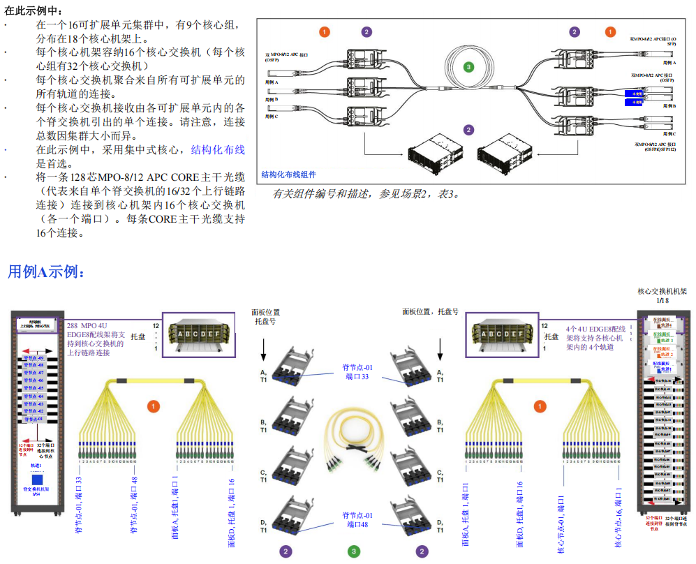 在此配置中,采用集中式核心,結(jié)構(gòu)化布線是首選。單條128芯MPO-8/12 APC CORE主干光纜可從脊交換機(jī)引出16或32個上行鏈路連接,連接到核心機(jī)架內(nèi)的16個核心交換機(jī)(各一個端口)。每個CORE主干光纜最多可支持16個連接。