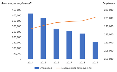 Light Reading匯編的數(shù)據(jù)顯示,其每名員工的收入已從2014年的約275,000歐元(296,900美元)增加到去年的382,000歐元(412,400美元)以上,為股東帶來了更為豐厚的利潤。