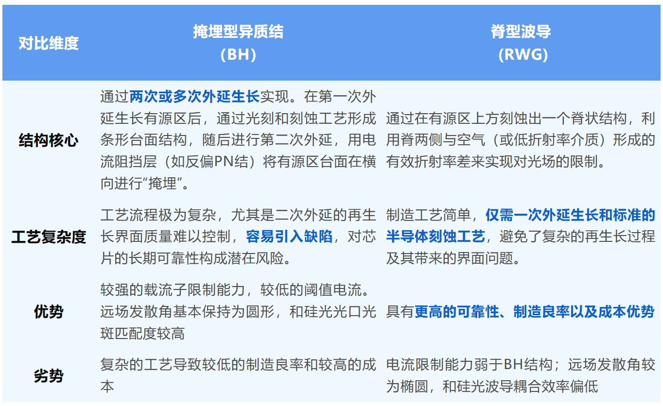 在CW DFB光源芯片中,為了實(shí)現(xiàn)穩(wěn)定的單橫模輸出,必須引入有效的橫向光場(chǎng)和載流子限制結(jié)構(gòu)。目前,掩埋型異質(zhì)結(jié)(BH)和脊型波導(dǎo)(RWG)是業(yè)內(nèi)兩種主流的波導(dǎo)結(jié)構(gòu)設(shè)計(jì),不同設(shè)計(jì)也決定了相應(yīng)的激光器的性能、制造工藝和適用場(chǎng)景。以下列表對(duì)比說(shuō)明兩種方案的優(yōu)缺點(diǎn):