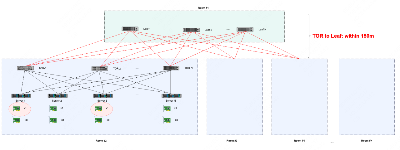 在AI網(wǎng)絡(luò)中,網(wǎng)絡(luò)部署受規(guī)模、空間、電力等因素影響,以二層網(wǎng)絡(luò)為例,TOR交換機(jī)和Leaf交換機(jī)部署在不同的房間,TOR到Leaf的距離可能達(dá)到150米。如何通過(guò)統(tǒng)一、高效以及低成本的光互聯(lián)方案滿足智算中心互聯(lián)需求,是當(dāng)前智算網(wǎng)絡(luò)建設(shè)的痛點(diǎn)。