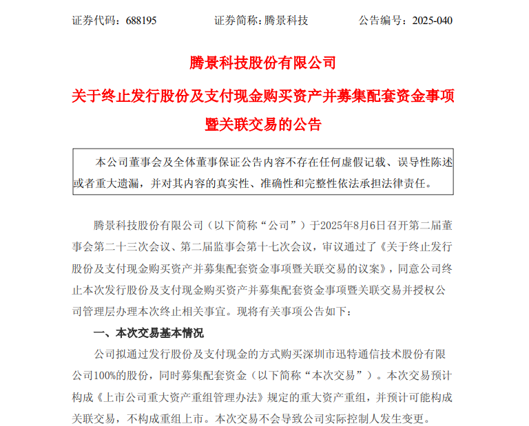 公告顯示,騰景科技于2025年8月6日召開第二屆董事會(huì)第二十三次會(huì)議及第二屆監(jiān)事會(huì)第十七次會(huì)議,審議通過了終止該交易的議案。公司管理層已獲授權(quán)辦理終止相關(guān)事宜。