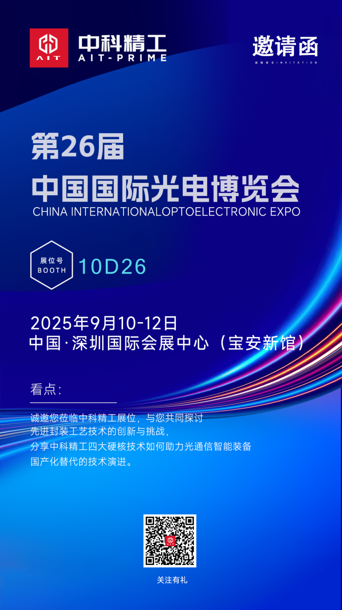2025年9月10-12日,中科精工將攜400G/800G/1.6T高速光模塊全棧封測解決方案亮相第26屆CIOE中國國際光電博覽會,展會期間集中展示光學耦合設(shè)備、AOI檢測設(shè)備、1um固晶機、探針臺設(shè)備。