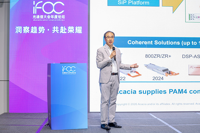 Cisco的Herrick Wang發(fā)表了《解鎖下一代光網(wǎng)絡(luò)的核心芯片機(jī)遇——Acacia 如何賦能高速光模塊的演進(jìn)與創(chuàng)新》主題演講。Acacia公司提供完整的 PAM4 直接檢測(cè)光組件產(chǎn)品組合,其 PAM4 光引擎已實(shí)現(xiàn)百萬級(jí)的年出貨規(guī)模。Herrick Wang介紹了Acacia的產(chǎn)品核心,包括:采用硅光技術(shù)的發(fā)射 PIC,支持 100G/通道與 200G/通道的多種配置,集成驅(qū)動(dòng)器并具備高可靠性與低插入損耗;以及集成 TIA 的硅光接收光引擎,在誤碼率、接收靈敏度和功耗方面性能領(lǐng)先。此外,其 3nm 工藝的 1.6T PAM4 DSP “Kibo” 支持多種工作模式,可使模塊功耗低于 25W,并具備先進(jìn)的通道損傷補(bǔ)償能力。Acacia 致力于以全面的組件解決方案,助力客戶贏得 AI 驅(qū)動(dòng)下高速增長(zhǎng)的客戶側(cè)光模塊市場(chǎng)。