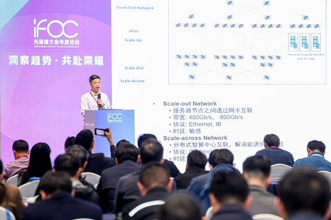 康寧光通信市場(chǎng)技術(shù)總監(jiān)陳皓帶來了《AI 智算網(wǎng)絡(luò)(scale out/up)的光纖技術(shù)演進(jìn)》主題演講。陳總在演講中提到,在AI數(shù)據(jù)中心中使網(wǎng)絡(luò)架構(gòu)發(fā)生了變化。其中,光纖作為關(guān)鍵物理層基礎(chǔ)設(shè)施,其應(yīng)用也呈現(xiàn)出不同特點(diǎn):在Scale out 架構(gòu)中,多模和單模光纖主要承擔(dān)大規(guī)模、中短距的機(jī)架間互連;而在Scale up 架構(gòu)中,單模光纖則更多用于機(jī)柜內(nèi)板卡與芯片間,實(shí)現(xiàn)高速、低損耗的互連。陳總在報(bào)告中詳細(xì)分析兩種架構(gòu)下光纖技術(shù)的發(fā)展趨勢(shì)與應(yīng)用場(chǎng)景。