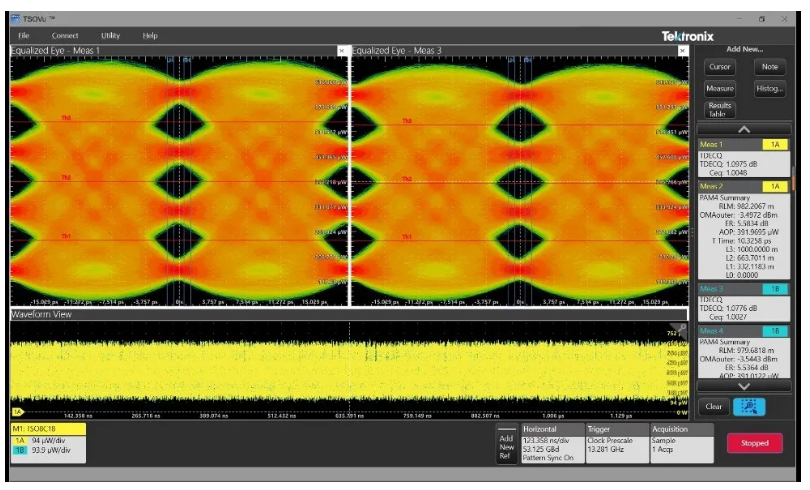 本次CIOE現(xiàn)場聯(lián)合演示的是索爾思最新的400G-DR4模塊。在被測模塊端使用20/80分光器, 20%的信號進(jìn)入TCR801作時(shí)鐘恢復(fù),剩余的80%使用額外的50/50分光器,分別進(jìn)入TSO820 Channel 1A和1B。我們可以看到兩個(gè)通道較為一致的測試結(jié)果。下圖是實(shí)測眼圖,實(shí)現(xiàn)高性能TDECQ表現(xiàn)。