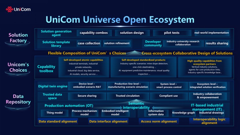 Universe生態(tài)開放平臺是中國聯(lián)通邁向“融合創(chuàng)新星辰大?!钡闹匾獙嵺`,標志著企業(yè)生態(tài)合作模式由“能力疊加”向“體系協(xié)同”升級。平臺以可信數(shù)據(jù)空間為基礎,打通OT與IT數(shù)據(jù)語義壁壘,聚合連接、算力、服務、安全等原子能力及生態(tài)伙伴優(yōu)質能力,構建可復制、可推廣的行業(yè)解決方案模板庫,形成開放共享、協(xié)同創(chuàng)新的生態(tài)體系。