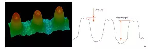 1) Core Dip描述:由于光纖的纖芯相對于包層材質較軟,因此在研磨過程中更容易被切削,從而形成纖芯(相對于包層)的凹陷,稱之為“Core Dip”。如下圖所示,即多模MT/MPO產(chǎn)品的光纖纖芯“Core Dip”