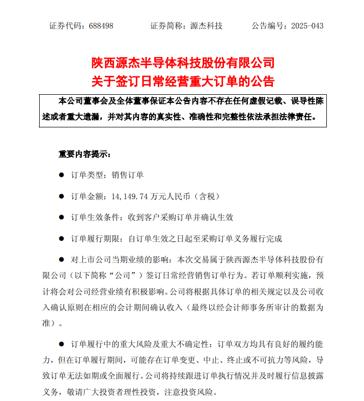 據(jù)了解,2025年一季度,源杰科技實現(xiàn)收入8440萬元,歸母凈利潤1432萬元。1.41億訂單金額相當(dāng)于其一季度總收入的167%,若順利實施將顯著提升公司經(jīng)營業(yè)績。
