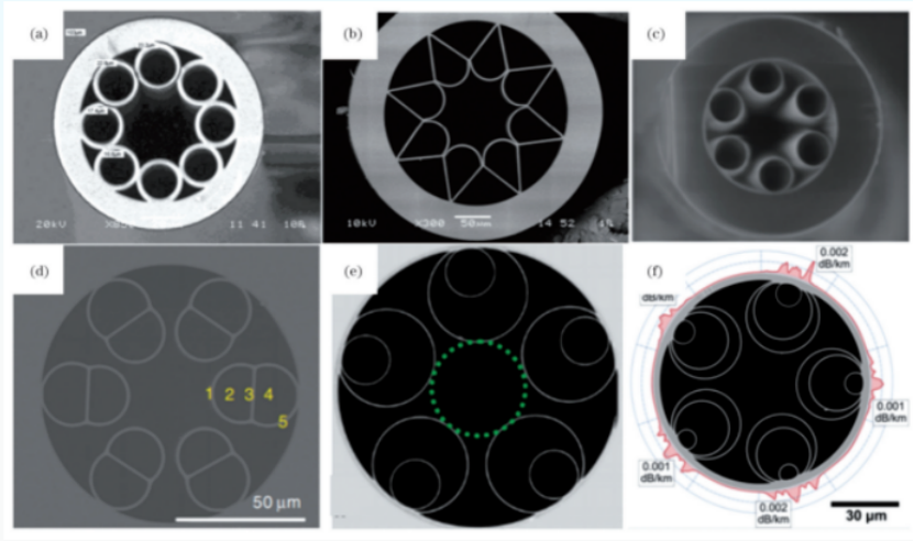 利用包層中單個或多個薄壁玻璃毛細(xì)管的反諧振效應(yīng),將光反射并局限在空氣芯內(nèi)。近年來,嵌套反諧振無節(jié)點(diǎn)光纖因其更寬的低損耗帶寬和更簡單的結(jié)構(gòu),成為極具潛力的發(fā)展方向。