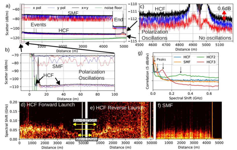 圖3 4.9公里DNANF的偏振分辨OFDR測量;(a)顯示SMF、HCF和電子噪聲底;(b)和(c)分別放大了光纖發(fā)射端和HCF末端;(d-f)通過背向散射相關(guān)性獲得的偏振間光譜移動,分別對應(yīng)HCF正向發(fā)射、反向發(fā)射和SMF參考;(g)比較了多種光纖的平均偏振光譜移動