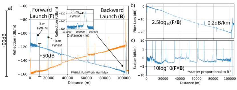 圖4 通過50個波長平均的100公里范圍的測量結(jié)果;(a)正向和反向測試OFDR曲線;(b)光纖損耗;(c)散射系數(shù)