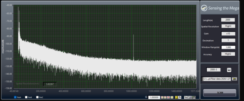 近期,昊衡科技OFDR設(shè)備也對某1公里左右的空芯光纖進(jìn)行了實際測試,從結(jié)果曲線中可以看出,隨著距離增加,其傳輸損耗逐漸變大;因客戶的空芯光纖類型為PBGF,主要用于傳感,其OFDR掃描曲線符合理論要求。