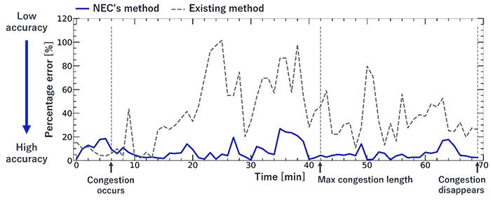通過(guò)上述創(chuàng)新,NEC 利用真實(shí)數(shù)據(jù)驗(yàn)證,與依賴攝像頭等點(diǎn)式傳感器截?cái)嗝鏀?shù)據(jù)的既有方法相比,行程時(shí)間預(yù)測(cè)誤差(衡量擁堵預(yù)測(cè)精度的關(guān)鍵指標(biāo))可減少約 80%。